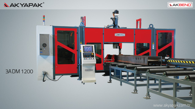 Материал, подлежащий сверлению, помещается на входной конвейер, изделие зажимается гидравлическими клещами, и подающий механизм с сервоприводом направляет изделие в зону сверления. С помощью лазерной линейки положение заготовки выстраивается на ноль, после сверления заготовка зажимными клещами подается на ленточную пилу. С помощью 3ADM 1200 на длине профиля 500мм можно производить сверление не перемещая профиль, что позволяет экономить время обработки.